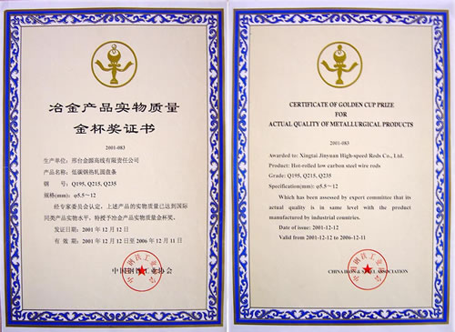 Low carbon and hot rolled wire Q195,Q215 and Q235 awarded the Gold Cup Prize of Metallurgy products.