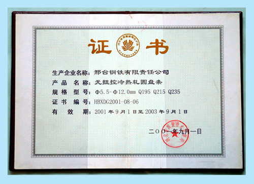 The hot rolled,torsion-free and controlled cooling wire was awarded the Quality Reliable Products of Hebei.
