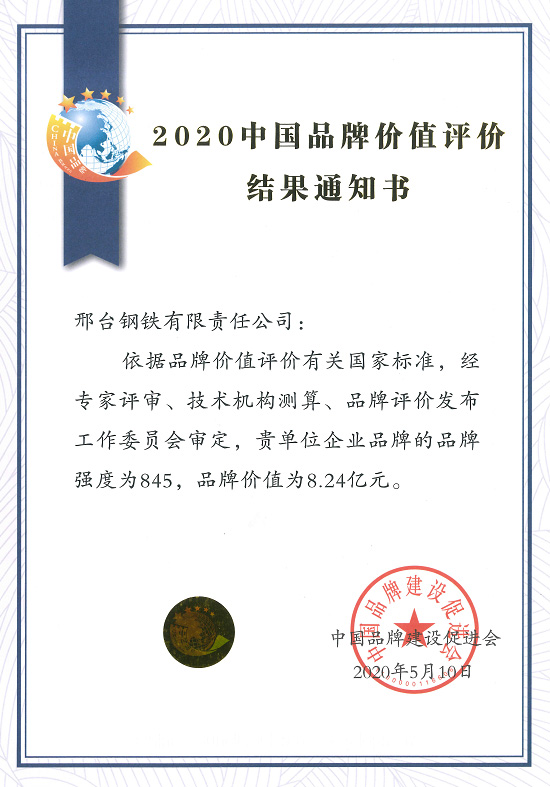 In Chinese Brands Day, “2020 China brand value evaluation information release” online activities were held. Xingtai Steel received the notification of evaluation results. It is shown that our company getson the brand value ranking list of nonferrous metallurgy group. This is the first time that Xingtai Steel hasgoton this list.