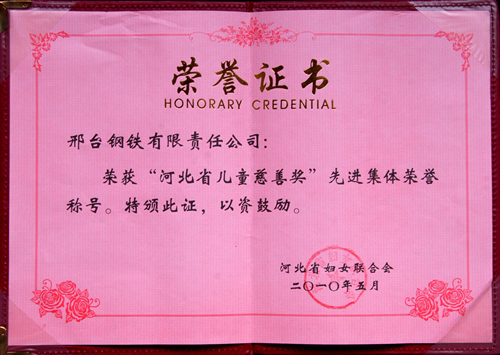 2010年5月,邢鋼榮獲“河北省兒童慈善獎(jiǎng)”先進(jìn)集體榮譽(yù)稱(chēng)號(hào)。
