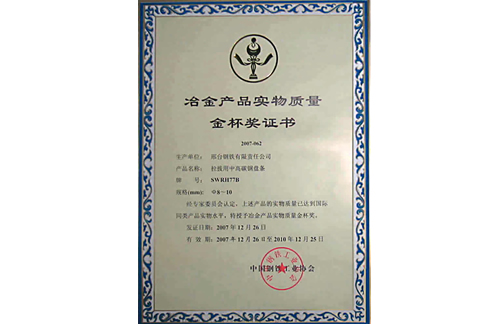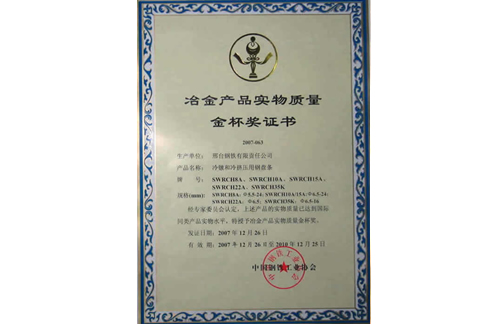 2007年12月,邢鋼冷鐓和冷擠壓用鋼盤條獲冶金產(chǎn)品實(shí)物質(zhì)量金杯獎。