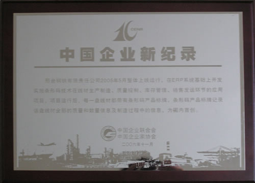 2006年11月,邢臺(tái)鋼鐵有限責(zé)任公司2005年整體上線運(yùn)行,在ERP系統(tǒng)基礎(chǔ)上開(kāi)發(fā)實(shí)施條行碼技術(shù)在線材生產(chǎn)制造、質(zhì)量控制、庫(kù)存管理、銷售發(fā)運(yùn)環(huán)節(jié)的應(yīng)用項(xiàng)目,項(xiàng)目運(yùn)行后每一條線材都帶有條型碼產(chǎn)品標(biāo)牌,條型碼產(chǎn)品標(biāo)牌記錄該盤線材全部的質(zhì)量和數(shù)量信息及制造過(guò)程中的信息,為國(guó)內(nèi)首創(chuàng)。