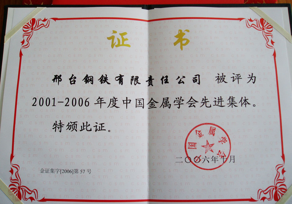 2006年10月,邢鋼榮獲中國(guó)金屬學(xué)會(huì)先進(jìn)集體證書(shū)。