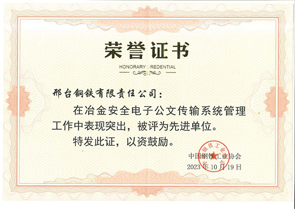 2023年10月,邢鋼在冶金安全電子公文傳輸系統(tǒng)管理工作中表現(xiàn)突出,被中國鋼鐵工業(yè)協(xié)會評為先進單位。