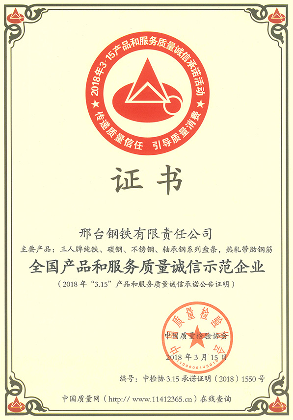 2018年3月15日,邢鋼(主要產(chǎn)品:三人牌純鐵、碳鋼、不銹鋼、軸承鋼系列盤條和熱軋帶肋鋼筋),被中國質(zhì)量檢驗(yàn)協(xié)會(huì)授予“全國產(chǎn)品和服務(wù)質(zhì)量誠信示范企業(yè)”稱號(hào)。