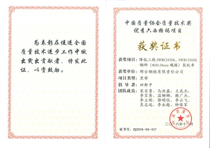 邢鋼榮獲2018年中國質量協(xié)會六西格瑪優(yōu)秀項目獎