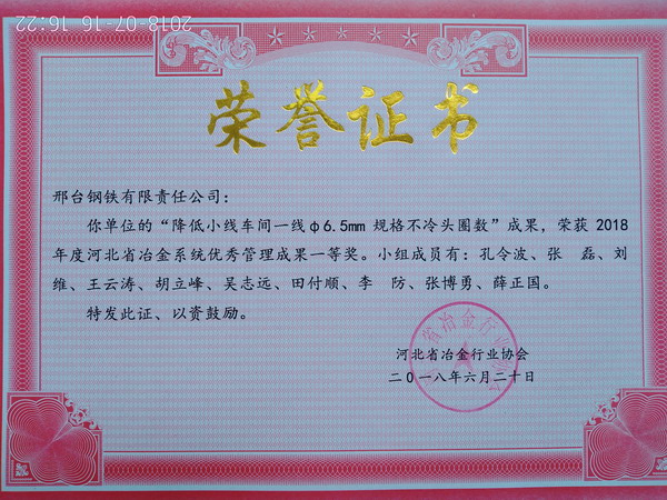 河北省冶金行業(yè)協(xié)會于6月份在秦皇島召開了“全省冶金行業(yè)質(zhì)量管理優(yōu)秀成功發(fā)布會”,邢鋼線材廠小線車間工藝技術(shù)QC小組《降低小線車間一線6.5mm規(guī)格不冷頭圈數(shù)》在發(fā)布會上進行了成功發(fā)布,獲得本次發(fā)布會一等獎的好成績。