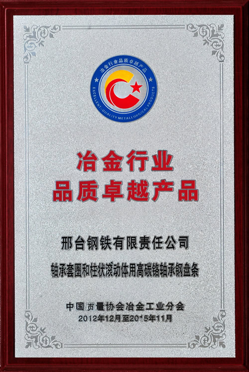 邢鋼軸承鋼盤條榮獲“冶金行業(yè)品質(zhì)卓越產(chǎn)品”榮譽(yù)稱號