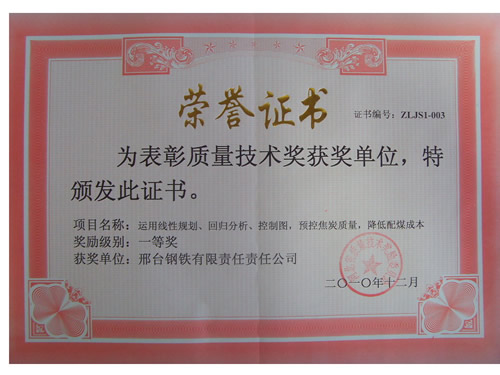 近日獲悉,我公司申報的“運(yùn)用線性規(guī)劃、回歸分析、控制圖預(yù)控焦炭質(zhì)量,降低配煤成本”質(zhì)量技術(shù)成果,經(jīng)河北省質(zhì)量技術(shù)獎勵委員會評選,獲得一等獎。該項目是焦化廠運(yùn)用質(zhì)量統(tǒng)計技術(shù)工具經(jīng)過實踐取得的一項質(zhì)量技術(shù)成果。通過實施該項目,配合煤成本比2008年降低了4775萬元,保持了焦炭質(zhì)量的持續(xù)穩(wěn)定。