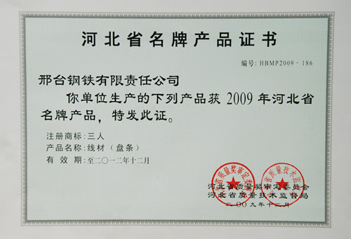 近日獲悉,2009年度邢鋼申報的“三人”牌線材產(chǎn)品,涵蓋冷墩鋼、簾線鋼、預(yù)應(yīng)力用鋼、優(yōu)質(zhì)碳素鋼、焊條用鋼、一般用低碳鋼、工業(yè)用純鐵、軸承鋼、彈簧鋼、機械結(jié)構(gòu)用鋼等十一個系列65個牌號線材產(chǎn)品榮獲“河北省名牌產(chǎn)品”。