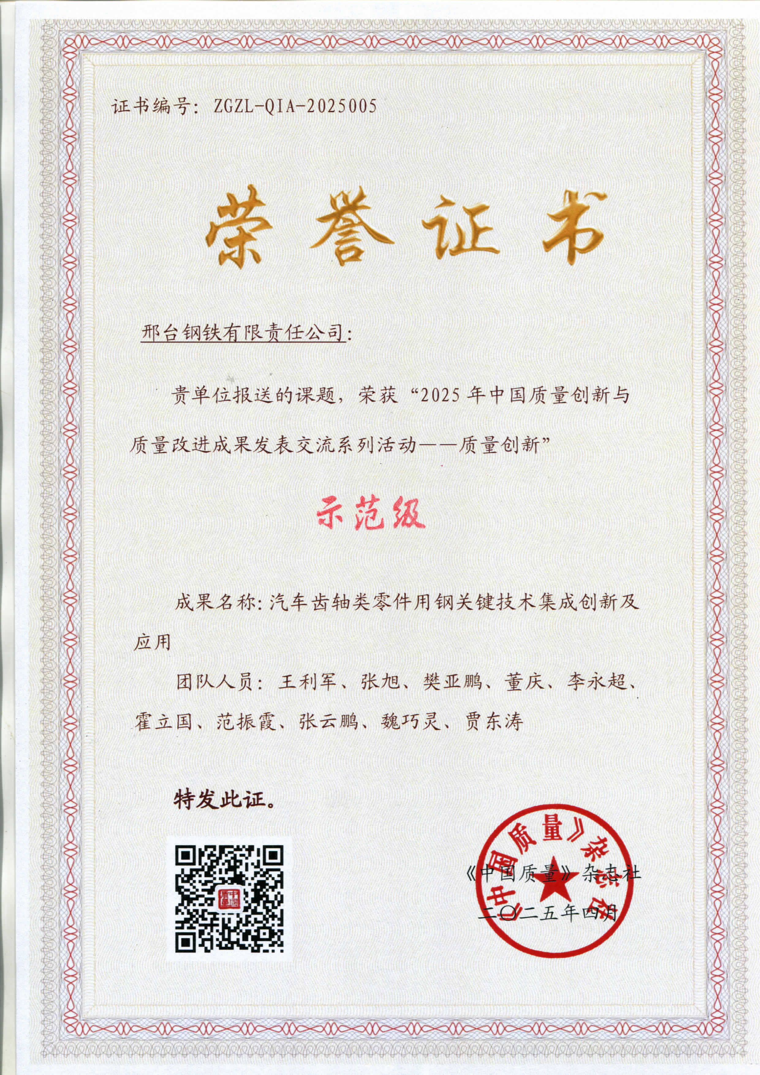 邢鋼團隊榮獲2025年中國質(zhì)量創(chuàng)新成果“示范級”殊榮
