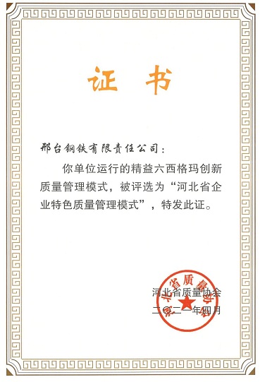 邢鋼獲評首批“河北省企業(yè)特色質(zhì)量管理模式”