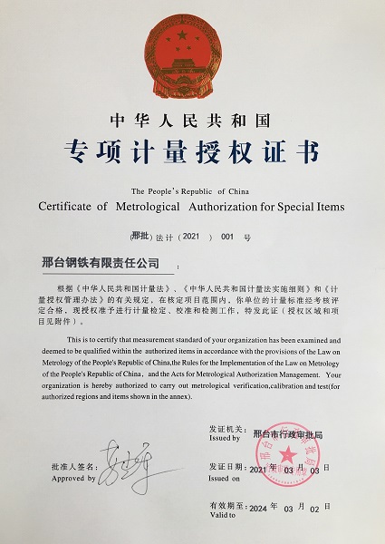 邢鋼四個(gè)檢定項(xiàng)目獲得國家專項(xiàng)計(jì)量授權(quán)
