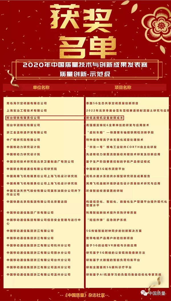 2020年9月15日-20日,邢鋼應(yīng)邀參加了《中國質(zhì)量》雜志社主辦的“2020年中國質(zhì)量技術(shù)與創(chuàng)新成果發(fā)表賽”,得到專家評委一致好評和現(xiàn)場觀眾高度認可,《降低連鑄機設(shè)備故障成本》榮獲質(zhì)量創(chuàng)新示范級成果、《降低燒結(jié)固體燃耗》榮獲精益項目專業(yè)級成果、《降低SCM435系列冷鐓鋼裂紋率》等其它6個項目榮獲改進級成果。