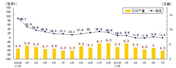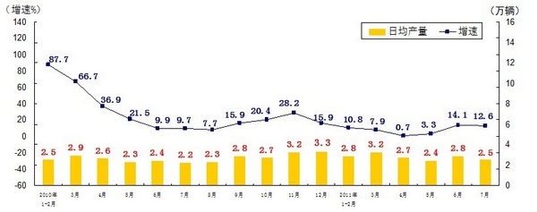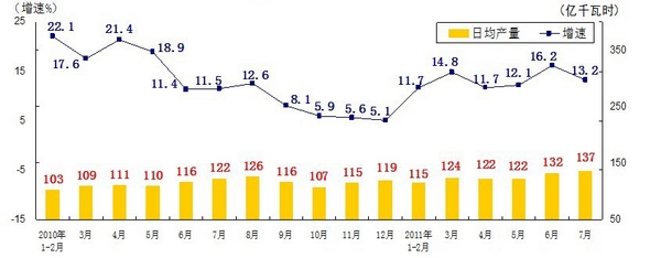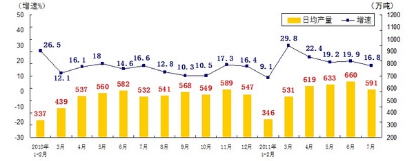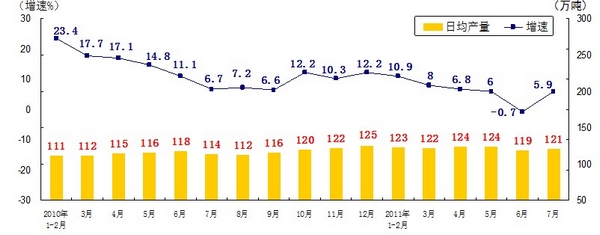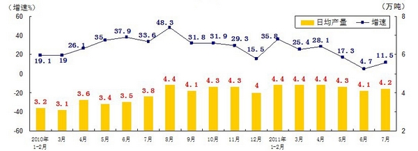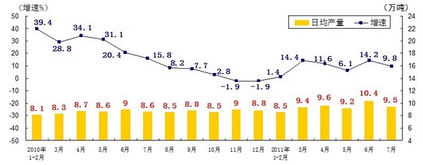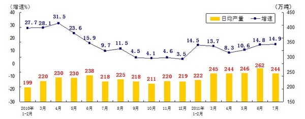 分產(chǎn)品看,7月份,468種產(chǎn)品中有381種產(chǎn)品同比增長(zhǎng)。其中,發(fā)電量4252億千瓦時(shí),日平均發(fā)電量137億千瓦時(shí),增長(zhǎng)13.2%;鋼材7572萬噸,日平均產(chǎn)量244萬噸,增長(zhǎng)14.9%;水泥18308萬噸,日平均產(chǎn)量591萬噸,增長(zhǎng)16.8%;原油加工量3749萬噸,日平均產(chǎn)量121萬噸,增長(zhǎng)5.9%;十種有色金屬293萬噸,日平均產(chǎn)量9.5萬噸,增長(zhǎng)9.8%;乙烯130萬噸,日平均產(chǎn)量4.2萬噸,增長(zhǎng)11.5%;汽車131.8萬輛,日平均產(chǎn)量4.3萬輛,下降1.3%;轎車77.7萬輛,日平均產(chǎn)量2.5萬輛,增長(zhǎng)12.6%。(參見附圖)