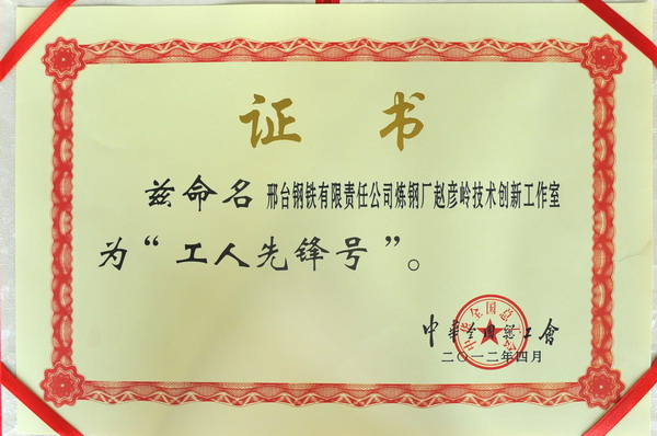 經(jīng)邢臺市總工會推薦,逐級申報(bào),五一前夕,中華全國總工會命名邢臺鋼鐵有限責(zé)任公司煉鋼廠趙彥嶺技術(shù)創(chuàng)新工作室為國家級“工人先鋒號”。