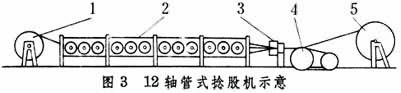 卷線:將鋼絲線盤,重新卷在捻股機的工字輪上;也可將鋼絲從拔絲機后直接卷到工字輪上;捻股:將鋼絲捻成繩股。捻股機有筐籃式、軸管式、無管式和雙捻機等。圖3為12軸管式捻股機示意圖,1是裝下層繩股的工字輪,2是旋轉(zhuǎn)的機筒,內(nèi)裝12個卷滿鋼絲的工字輪,3是成股的壓線瓦,4是牽引輪,5是上層繩股的收線輪,機筒旋轉(zhuǎn)一周,牽引輪引出的繩股長度即為股的捻距。