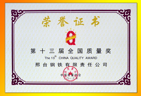 邢鋼喜獲“全國質量獎”