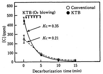 由上圖可以看出,脫碳處理初始階段采用KTB吹氧可以明顯提高脫碳速率。采用KTB和不采用KTB的表觀脫碳速率常數(shù)分別為0.35min-1、0.21min-1,而且由于采用KTB吹氧技術(shù)提高了脫碳速率,可以使脫碳處理時間縮短了3min。