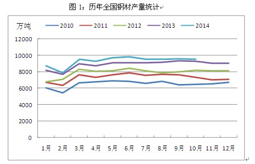 其一,鋼材產(chǎn)量增速有所回落。根據(jù)統(tǒng)計,2014年1-10月,我國粗鋼產(chǎn)量68535萬噸,同比增長2.1%,增速同比減緩7.1個百分點;鋼材產(chǎn)量93447萬噸,增長4.7%,減緩6.9個百分點,國家政策的導(dǎo)向在這其中起了主要作用。一方面,2014年我國從政策上嚴(yán)格限制了鋼鐵等產(chǎn)能過剩行業(yè)的投資,由此導(dǎo)致除新疆地區(qū)外,其余省份全年均無高爐新建計劃,鋼鐵新增產(chǎn)能被控制;另一方面,京津冀地區(qū)持續(xù)霧霾天氣引發(fā)了公眾普遍擔(dān)憂,作為全國鋼鐵生產(chǎn)基地的河北省不時由于環(huán)境污染而被強制采取限產(chǎn)措施,雖然對于環(huán)保排污設(shè)施較為齊全的大型鋼廠影響有限,但中小型鋼廠的生產(chǎn)卻受到了較為明顯的影響,全國鋼材整體產(chǎn)量增速下滑也就變得順理成章