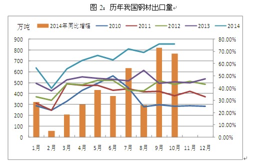 其二,鋼材出口大幅增加。在前兩年鋼材出口增速始終徘徊不前的情況下,2014年我國鋼材出口量增長迅速,海關(guān)數(shù)據(jù)顯示,2014年1-10月我國共出口鋼材7389.3萬噸,同比大幅增長42.2%,在2014年之前,鋼材出口只占我國鋼鐵行業(yè)總產(chǎn)量中微不足道的3%,而2014年這一占比卻猛增到10%以上,外需大增極大程度上緩解了國內(nèi)鋼鐵行業(yè)的供應(yīng)壓力,這也導(dǎo)致在鋼材產(chǎn)量仍在緩慢增長的情況下我國鋼鐵行業(yè)供需關(guān)系卻有所緩和。