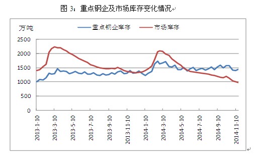 其三,鋼廠經(jīng)營風(fēng)險有所上升。由于近兩年鋼價持續(xù)大幅下跌,市場上的鋼貿(mào)商苦不堪言,相較于家大業(yè)大且有地方政府扶持的鋼廠,鋼貿(mào)商的日子更加難熬,在持續(xù)虧損以及資金壓力下,超半數(shù)鋼貿(mào)商選擇退出。依然活躍于市場的鋼貿(mào)商在操作上也不復(fù)以往的大開大合,小心謹(jǐn)慎成為了多數(shù)鋼貿(mào)商的選擇,由此帶來的直接后果就是市場庫存向鋼廠庫存轉(zhuǎn)移。截止2014年10月末,全國主要城市鋼材庫存約為1043萬噸,較2013年同期相比大幅下降25.7%,與之相反的是,此時重點鋼企庫存增加到1414.3萬噸,較2013年同期上升9.8%,隨著鋼貿(mào)商 “蓄水池”功能的減弱,鋼廠對于價格調(diào)整以及生產(chǎn)策略的變動將更為敏感,但與此同時鋼廠也將承擔(dān)更大的經(jīng)營風(fēng)險。