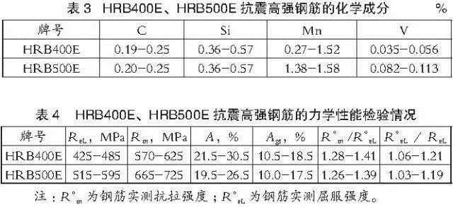 我國在GB 1499.2-2007標準中首次將鋼筋的抗震性能指標納入國標中,并規(guī)定了抗震鋼筋的三個代表性指標:強屈比(R?m /R?eL)、超屈比(R?eL/ReL)和最大力總伸長率(Agt)。國內(nèi)某鋼廠HRB400E、HRB500E抗震鋼筋多樣品檢驗獲得的化學(xué)成分和力學(xué)性能指標見表3和表4。