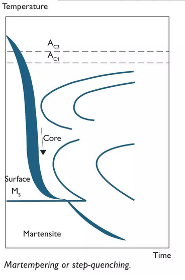 如今,用于合金鋼的淬火介質(zhì)有:硬化油、聚合物溶液、空氣和惰性氣體??諝庥不A粲糜诰哂懈叽阃感缘匿?,這在大多數(shù)情況下主要?dú)w因于錳、鉻和鉬的組合存在于鋼中。通過階梯淬火或者分級(jí)淬火可以減少變形和硬化裂紋的風(fēng)險(xiǎn)。在該方法中,材料在兩個(gè)步驟中淬火。首先,將其從硬化溫度冷卻直到表面的溫度剛好高于Ms溫度。然后必須保溫在那里直到表面和芯之間的溫度均衡。此后,冷卻過程繼續(xù)。這種方法允許芯和表面幾乎同時(shí)轉(zhuǎn)變成馬氏體并減少熱應(yīng)力。當(dāng)在真空爐中淬火時(shí),階梯淬火也是可能的。