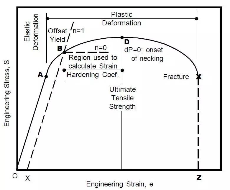 在拉伸曲線上,即工程應(yīng)變-工程應(yīng)變曲線上最大工程應(yīng)力稱為極限拉應(yīng)力,也就是抗拉強(qiáng)度。至于斷面收縮率和頸縮問(wèn)題就不再這里詳細(xì)講解述了。