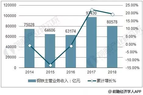 據(jù)前瞻產(chǎn)業(yè)研究院發(fā)布的《中國(guó)鋼鐵行業(yè)發(fā)展前景與投資戰(zhàn)略規(guī)劃分析報(bào)告》指出,2018上半年中國(guó)鋼鐵行業(yè)主營(yíng)業(yè)務(wù)收入達(dá)到30525億元,累計(jì)增長(zhǎng)15.8%?;仡?012-2017年鋼鐵行業(yè)營(yíng)業(yè)收入情況:近六年來,我國(guó)鋼行業(yè)營(yíng)業(yè)收入較為穩(wěn)定,2015年以來累計(jì)增長(zhǎng)率逐漸回暖。中國(guó)鋼鐵行業(yè)將繼續(xù)保持穩(wěn)中有長(zhǎng)趨勢(shì),預(yù)計(jì)2018年中國(guó)鋼鐵行業(yè)營(yíng)收將突破80000億元。