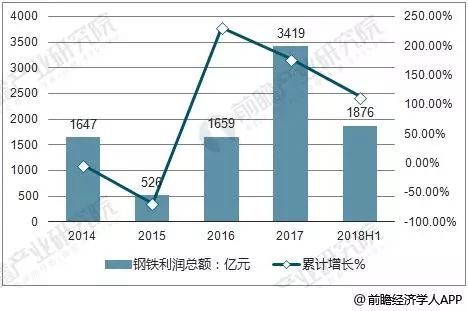 近年來,鋼鐵行業(yè)盈利能力持續(xù)穩(wěn)定增長(zhǎng),2017年鋼鐵行業(yè)利潤(rùn)總額達(dá)到3419億元,與2016年相比增長(zhǎng)率高達(dá)177.8%;2018上半年行業(yè)利潤(rùn)達(dá)到1876億元,增長(zhǎng)率為113%,鋼鐵行業(yè)利潤(rùn)的整體向好。