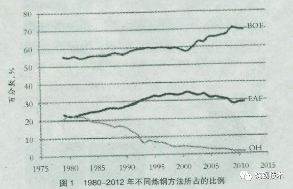 自此,氧氣轉(zhuǎn)爐煉鋼得到快速發(fā)展,而平爐煉鋼開始下降,如圖1所示。氧氣轉(zhuǎn)爐煉鋼發(fā)展超過(guò)平爐煉鋼的一個(gè)重要因素是連鑄技術(shù)的引進(jìn)。連鑄要求鋼水源源不斷供應(yīng),而氧氣轉(zhuǎn)爐的工藝時(shí)間比較短,能很容易地滿足連鑄的鋼水供應(yīng),一個(gè)大轉(zhuǎn)爐(350t)的產(chǎn)鋼速度為500t/h。與此相對(duì)照,如果平爐常規(guī)操作,煉鋼至出鋼需要12—14h,或者如果借助工業(yè)用氧加速也需要7—8h。目前在烏克蘭、俄羅斯和印度仍然存在一定數(shù)量的平爐冶煉。這些爐子正逐步被電弧爐取代,2012年平爐工藝總產(chǎn)鋼量1690萬(wàn)t,約占全球鋼產(chǎn)量的1.1%。