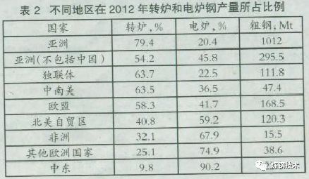 雖然電弧爐煉鋼產(chǎn)量沒有超過(guò)全球粗鋼總產(chǎn)量的三分之一(在2012年占29.3%),但由于中國(guó)在世界鋼產(chǎn)量的主導(dǎo)地位(占世界總量的46%),且它主要使用氧氣煉鋼,電弧爐煉鋼的影響被忽略,表2顯示了在2012年不同地區(qū)轉(zhuǎn)爐煉鋼及電弧爐煉鋼的相對(duì)比例。