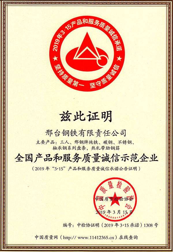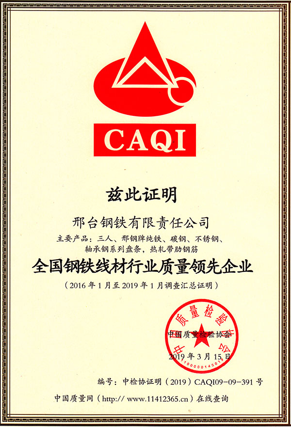 2019年初,邢鋼參加了中國質(zhì)量檢驗協(xié)會組織開展的2019年“3.15”產(chǎn)品和服務(wù)質(zhì)量誠信承諾主題活動。近日獲悉,公司被中國質(zhì)量檢驗協(xié)會授予“全國鋼鐵線材行業(yè)質(zhì)量領(lǐng)先企業(yè)”、“全國產(chǎn)品和服務(wù)質(zhì)量誠信示范企業(yè)”,公司主要產(chǎn)品:三人、邢鋼牌純鐵、碳鋼、不銹鋼、軸承鋼系列盤條,熱軋帶肋鋼筋被授予“全國質(zhì)量檢驗穩(wěn)定合格產(chǎn)品”并頒發(fā)了證書。