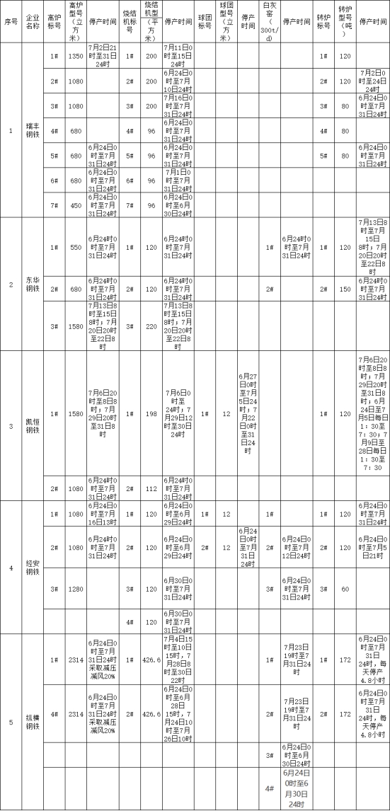 1、高爐限產(chǎn)50%,6月25日0時(shí)—7月12日12時(shí)停產(chǎn),7月12日12時(shí)—7月31日正常生產(chǎn),共停機(jī)17.5天。