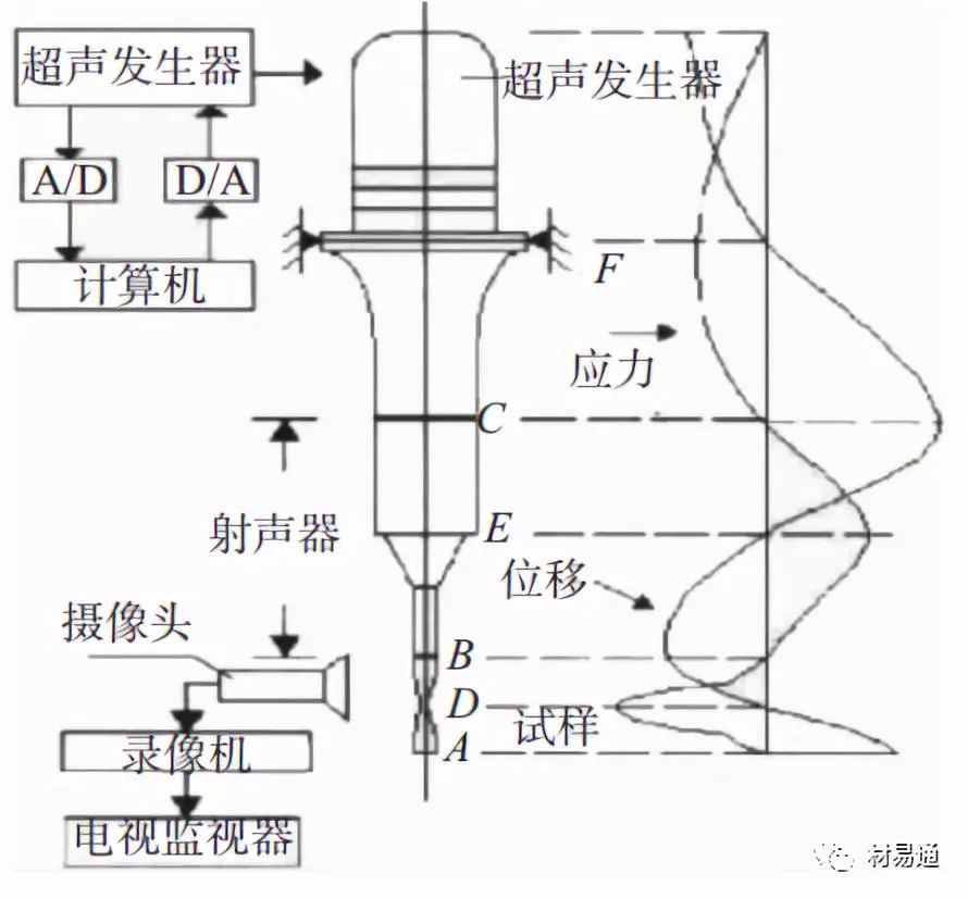 試驗(yàn)裝置主要包括:(1)超聲頻率發(fā)生器(將超聲正弦波電信號(hào)由50Hz轉(zhuǎn)變?yōu)?/span>20kHz);(2)壓力陶瓷換能器(將電源提供的電信號(hào)轉(zhuǎn)化成機(jī)械振動(dòng)信號(hào));(3)位移放大器(放大位移振幅使試樣獲得所需的應(yīng)變振幅)。試驗(yàn)裝置原理:由壓電陶瓷換能器、位移放大器和試樣組成的超聲疲勞試驗(yàn)機(jī)構(gòu)成了一個(gè)力學(xué)振動(dòng)系統(tǒng),試樣的加載是由外加信號(hào)激勵(lì)試樣發(fā)生諧振,在試樣中產(chǎn)生諧振波來實(shí)現(xiàn)。