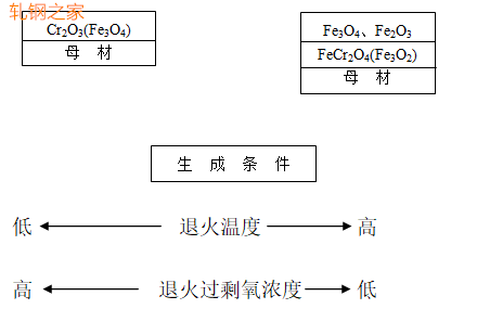 如果退火溫度高,過剩氧濃度低,則氧化鐵皮會形成雙層結(jié)構(gòu),厚度增加。退火溫度低、退火過剩氧濃度高,則氧化鐵皮為單層結(jié)構(gòu),厚度薄。