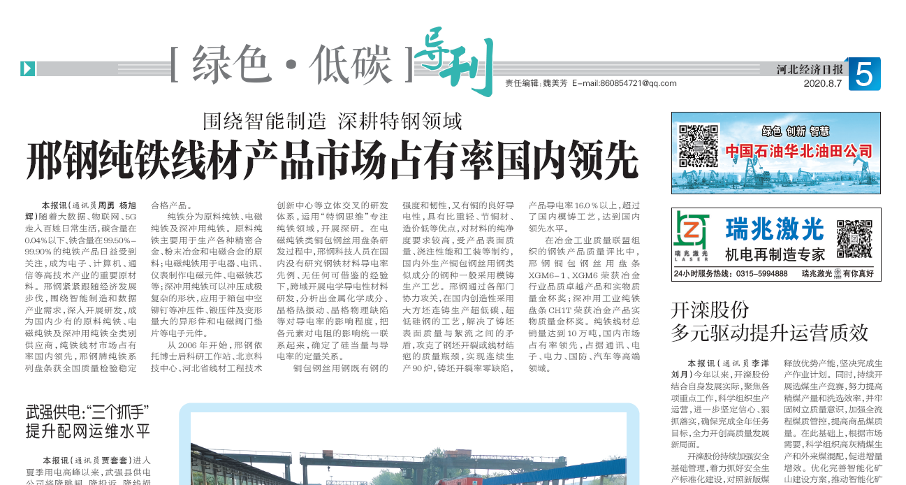 本報(bào)訊(通訊員周勇 楊旭輝)隨著大數(shù)據(jù)、物聯(lián)網(wǎng)、5G走入日常生活,碳含量在0.04%以下、鐵含量在99.50%-99.90%的純鐵產(chǎn)品日益受到關(guān)注,成為電子、計(jì)算機(jī)、通信等高技術(shù)產(chǎn)業(yè)的重要原材料。邢鋼緊緊跟隨我國(guó)經(jīng)濟(jì)發(fā)展步伐,圍繞智能制造和數(shù)據(jù)產(chǎn)業(yè)需求,深入開(kāi)展研發(fā),成為國(guó)內(nèi)少有的原料純鐵、電磁純鐵及深沖用純鐵全類別供應(yīng)商,純鐵線材市場(chǎng)占有率國(guó)內(nèi)領(lǐng)先,邢鋼牌純鐵系列盤條獲全國(guó)質(zhì)量檢驗(yàn)穩(wěn)定合格產(chǎn)品。