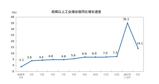2021年3月份,規(guī)模以上工業(yè)增加值同比實(shí)際增長14.1 %(以下增加值增速均為扣除價(jià)格因素的實(shí)際增長率)。從環(huán)比看,3月份,規(guī)模以上工業(yè)增加值比上月增長0.60%。一季度,規(guī)模以上工業(yè)增加值同比增長24.5%;比2019年同期增長14.0%,兩年平均增長6.8%。