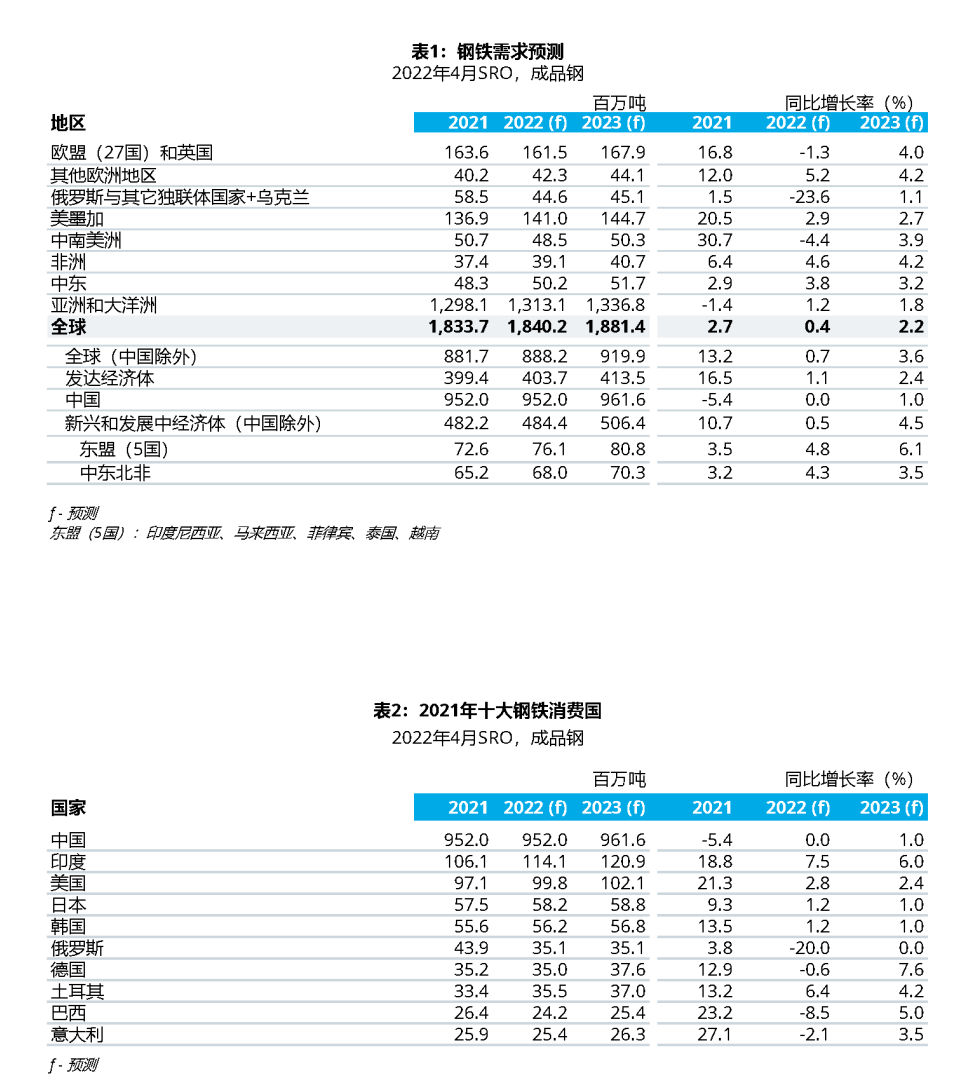 盡管出現(xiàn)零星幾輪疫情和制造業(yè)的供應(yīng)鏈限制,但在2021年鋼鐵需求仍然強(qiáng)勢(shì)復(fù)蘇,特別是在歐盟和美國(guó)。不過(guò),由于通脹壓力,以及圍繞烏克蘭發(fā)生的事件,2022年的鋼鐵需求前景走弱。烏克蘭戰(zhàn)爭(zhēng)的影響在歐盟地區(qū)尤為顯著,原因在于歐盟地區(qū)對(duì)俄羅斯能源的高度依賴以及難民的涌入。在發(fā)達(dá)經(jīng)濟(jì)體,繼2021年鋼鐵需求恢復(fù)16.5%之后,預(yù)計(jì)2022年和2023年鋼鐵需求將分別增長(zhǎng)1.1%和2.4%。