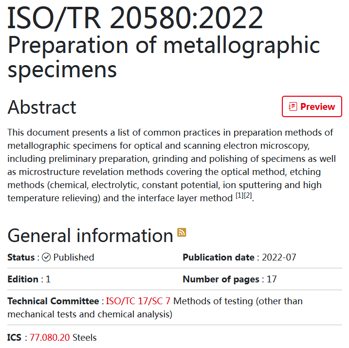 ISO/TR 20580:2022 Preparation of metallographic specimens《金相試樣的制備》國際標(biāo)準(zhǔn)近日批準(zhǔn)發(fā)布,這是由我國主導(dǎo)制定的又一項金相檢驗領(lǐng)域國際標(biāo)準(zhǔn)。