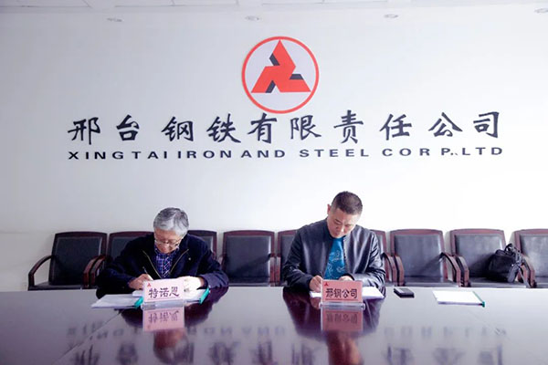 邢鋼董事長(zhǎng)張育明與特諾恩(意大利)銷售總監(jiān)陳捷簽訂電爐設(shè)備合同。