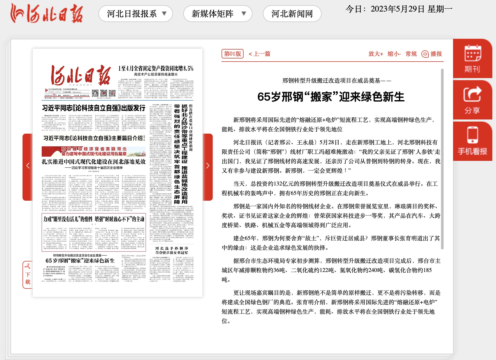 頭條 65歲邢鋼“搬家”迎來(lái)綠色新生
