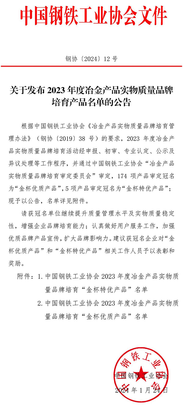 冶金產(chǎn)品實(shí)物質(zhì)量品牌培育產(chǎn)品認(rèn)定活動(dòng),是中鋼協(xié)在鋼鐵行業(yè)組織開(kāi)展的認(rèn)定評(píng)價(jià)活動(dòng),也是國(guó)內(nèi)唯一一項(xiàng)針對(duì)鋼鐵行業(yè)實(shí)物產(chǎn)品質(zhì)量進(jìn)行認(rèn)定的評(píng)價(jià)活動(dòng)。旨在評(píng)選行業(yè)標(biāo)桿產(chǎn)品,擴(kuò)大中國(guó)鋼鐵行業(yè)優(yōu)秀產(chǎn)品影響力及占有率,提升產(chǎn)品品牌價(jià)值與口碑。通過(guò)的產(chǎn)品,不僅代表了產(chǎn)品質(zhì)量的穩(wěn)定性和先進(jìn)性,更反映了企業(yè)管理的卓越性,是得到行業(yè)內(nèi)專(zhuān)家、同行和客戶(hù)都認(rèn)可的優(yōu)秀產(chǎn)品,對(duì)增加產(chǎn)品銷(xiāo)量、提高產(chǎn)品品牌起著重要的作用,是一種無(wú)形價(jià)值和財(cái)富。