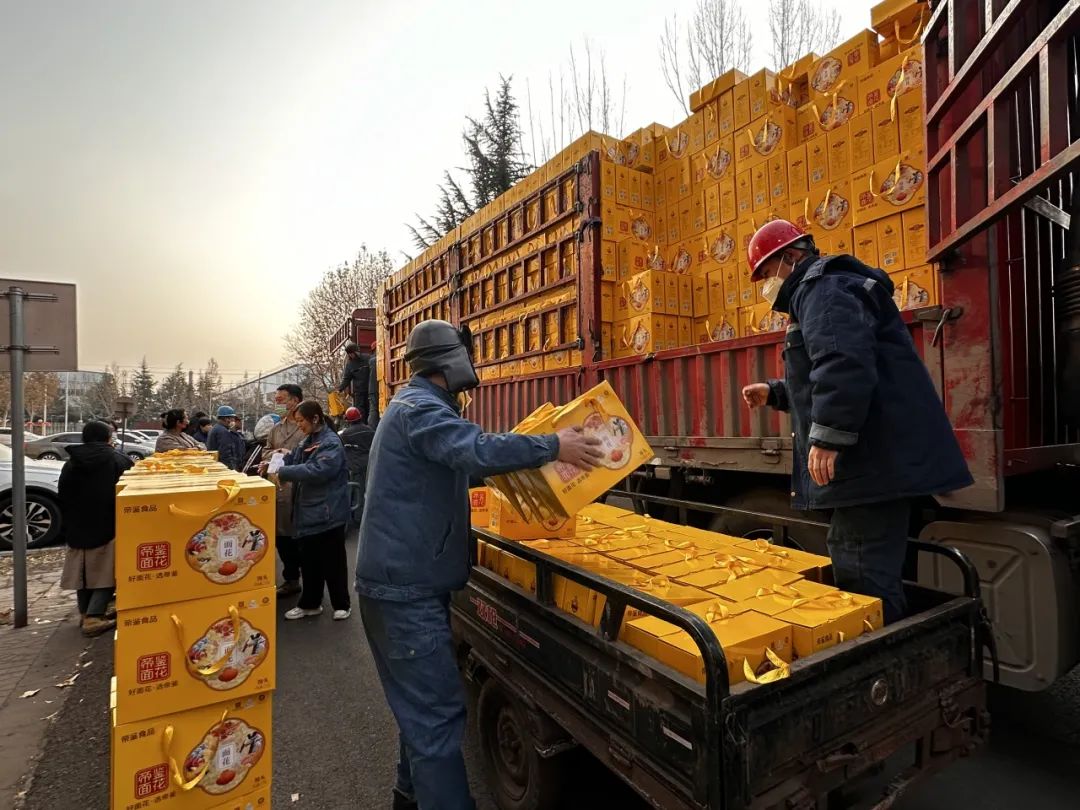 在公司各福利品發(fā)放點(diǎn),各單位員工紛紛匯聚于此,大家齊心協(xié)力,將一箱箱、一盒盒滿載祝福的禮品卸下,整齊堆碼,有序分發(fā),現(xiàn)場(chǎng)洋溢著一片熱鬧而溫馨的氛圍。