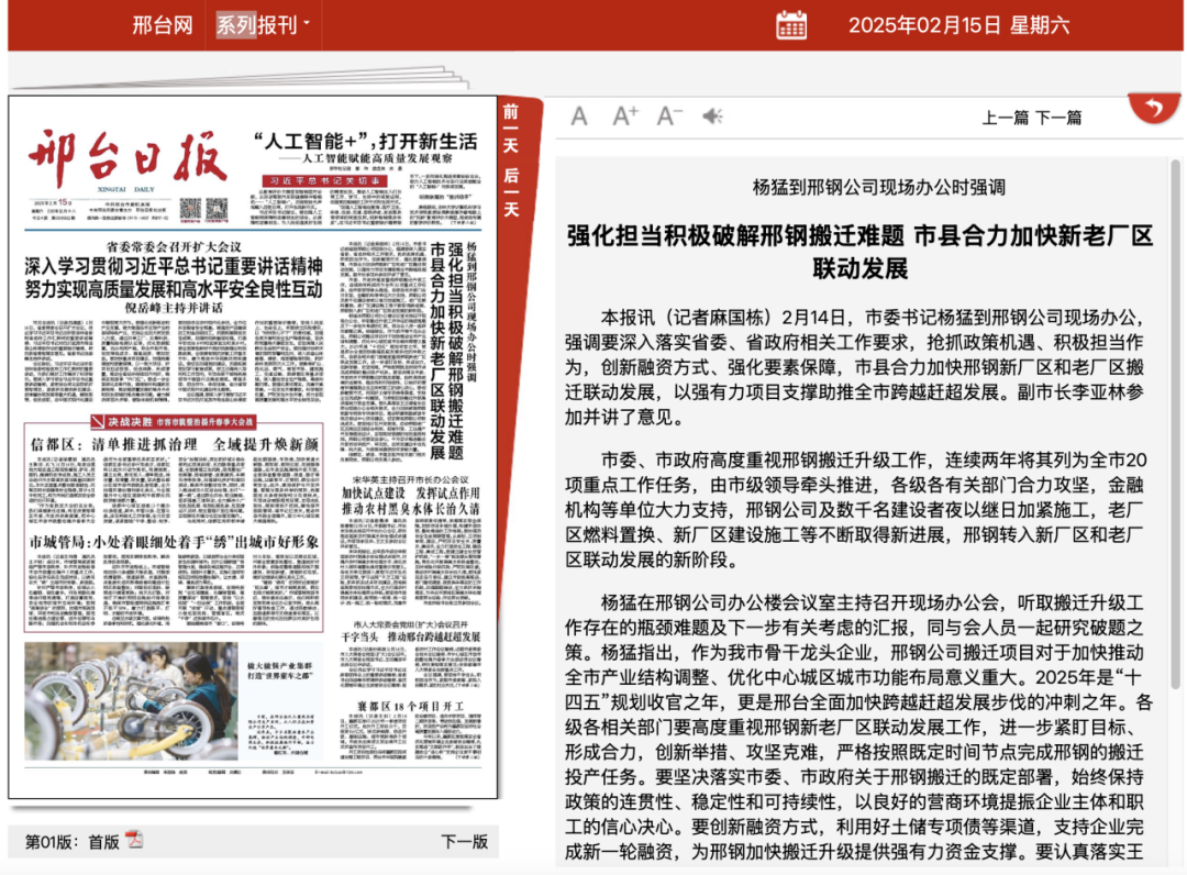 2月14日,市委書記楊猛到邢鋼公司現(xiàn)場(chǎng)辦公,強(qiáng)調(diào)要深入落實(shí)省委、省政府相關(guān)工作要求,搶抓政策機(jī)遇、積極擔(dān)當(dāng)作為,創(chuàng)新融資方式、強(qiáng)化要素保障,市縣合力加快邢鋼新廠區(qū)和老廠區(qū)搬遷聯(lián)動(dòng)發(fā)展,以強(qiáng)有力項(xiàng)目支撐助推全市跨越趕超發(fā)展。副市長(zhǎng)李亞林參加并講了意見。