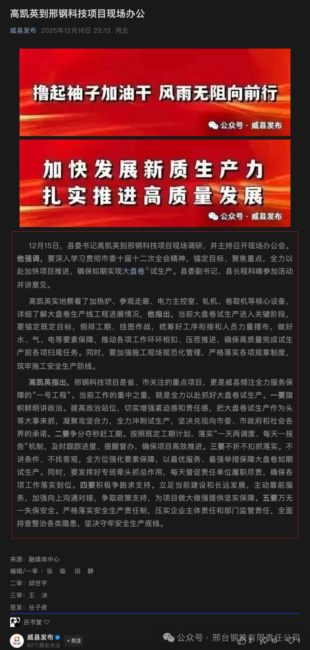 高凱英指出,邢鋼科技項目是省、市關注的重點項目,更是威縣傾注全力服務保障的“一號工程”。當前工作的重中之重,就是全力以赴抓好大盤卷試生產。一要旗幟鮮明講政治。提高政治站位,切實增強緊迫感和責任感,把大盤卷試生產作為頭等大事來抓,凝聚攻堅合力,全力沖刺試生產,堅決兌現向市委、市政府和社會各界的承諾。二要爭分奪秒趕工期。按照既定工期計劃,落實“一天兩調度、每天一報告”機制,及時跟蹤進度、提醒督辦,確保項目高效推進。三要不折不扣抓落實。不講條件、不找客觀,全方位強化要素保障,以最優(yōu)服務、最強舉措保障大盤卷如期試生產。同時,要發(fā)揮好專班牽頭抓總作用,每天督促責任單位履職盡責,確保各項工作落實到位。四要積極爭跑求支持。立足當前建設和長遠發(fā)展,主動靠前服務,加強向上溝通對接,爭取政策支持,為項目做大做強提供堅實保障。五要萬無一失保安全。嚴格落實安全生產責任制,壓實企業(yè)主體責任和部門監(jiān)管責任,全面排查整治各類隱患,堅決守牢安全生產底線。